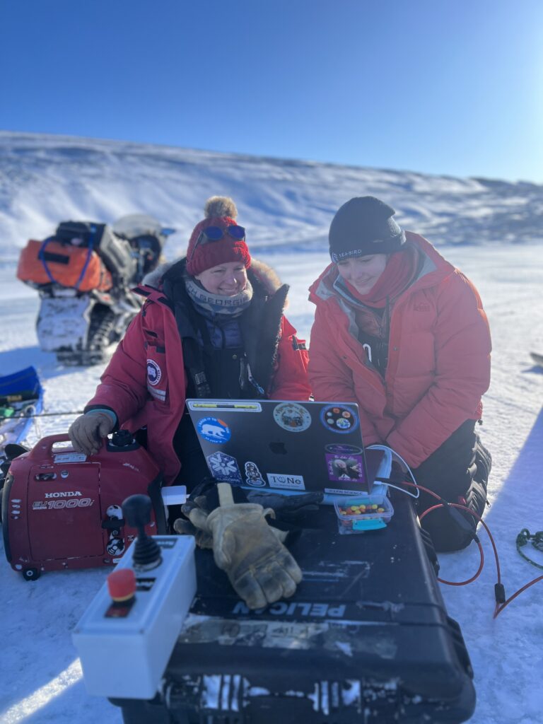 A priority of this season was to collect water samples early in the season – this is so important because the whole environment has not yet shifted from the dark of the winter to fully sunlit, so the communities under the ice are potentially quite different as a function of light and temperature. The team was able to get out as early as March 2nd to take our first samples at the mid-fjord. These samples will be used to study microbial masses, metal isotopes, and noble gases, which we will use to “fingerprint” water masses-determining where the water has formed and with what it’s interacted. The most important questions we have are where the ocean water forms, and how much melt water – which can be sourced from the the melting of the base of the glacier by the ocean or from the melting from the sea ice – is contributing to the fjord. These samples are difficult to collect as it is imperative that they not freeze – which is not particularly difficult when it is –40 degrees out!