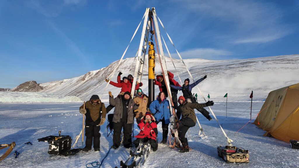 After that, we moved to Rasmussen glacier, excited to find the subglacial channel again. This took three attempts, and included some major challenges as we had to take a few days to repair one of our winches before heading back out to the ice. But, third time was a charm – sort of. The team, now all veterans of at least two other dives, worked together seamlessly, fixed equipment as challenges arose, and had an incredible day out on the ice. Icefin swam out to where we’d found the channel last year, where we found some combination of a crevasse and a channel – a “crevannel”, if you will. After twenty minutes of nailbiting maneuvering through the labyrinthine crevasse, we pulled the robot back to the face of the glacier, continued a sonar scan for other signs of channels, and brought Icefin back for a team picture.