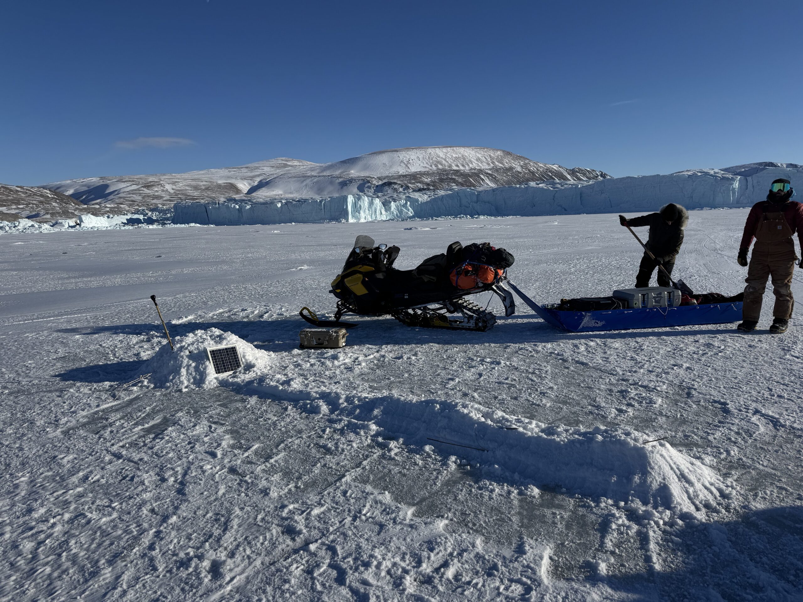Seismic array – The objective of this part of the SSHOWUP project is to observe the front of a glacier for several weeks with seismometers and to “listen” for calving events and movement in the sea ice due to tides. Using this data, we hope to better understand how sound waves move through different types of ice and what we can learn about the ice by examining how the waves change as they move from one point to another. The deployment of the sensors was the culmination of a several-week effort. First, we used satellite imagery data to determine the best locations for the seismometers. Then, we needed at least a half day with good weather and no other major science goals to go out and drill the holes. Moltke glacier is a long trip away from base, so finding the time to do this took a while. Lastly, after the holes were drilled, we needed to wait at least a day before installing the seismometers: these sensors require a very flat and level surface to work properly, which we achieve by pouring water into the bottom of their holes and waiting for it to freeze––gravity reliably makes a perfect, level surface! This past Thursday, with the holes prepared and ready, Daniel, Justin, Phil, and Mike made the trip out to Moltke and successfully deployed the seismometers.